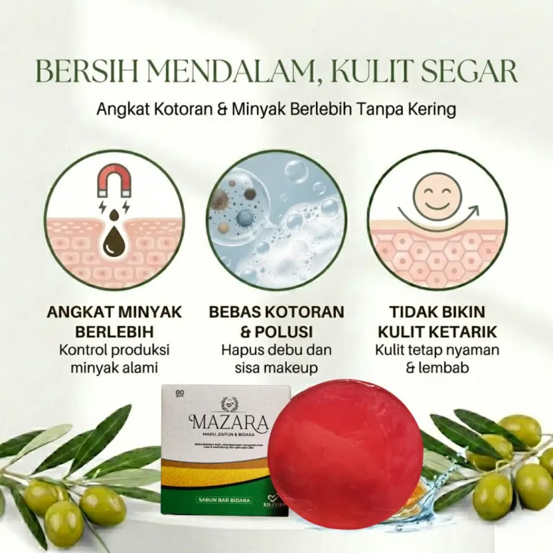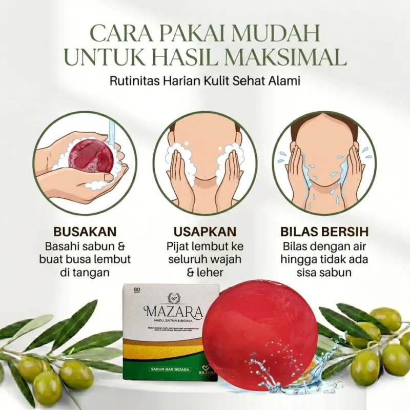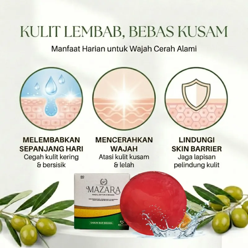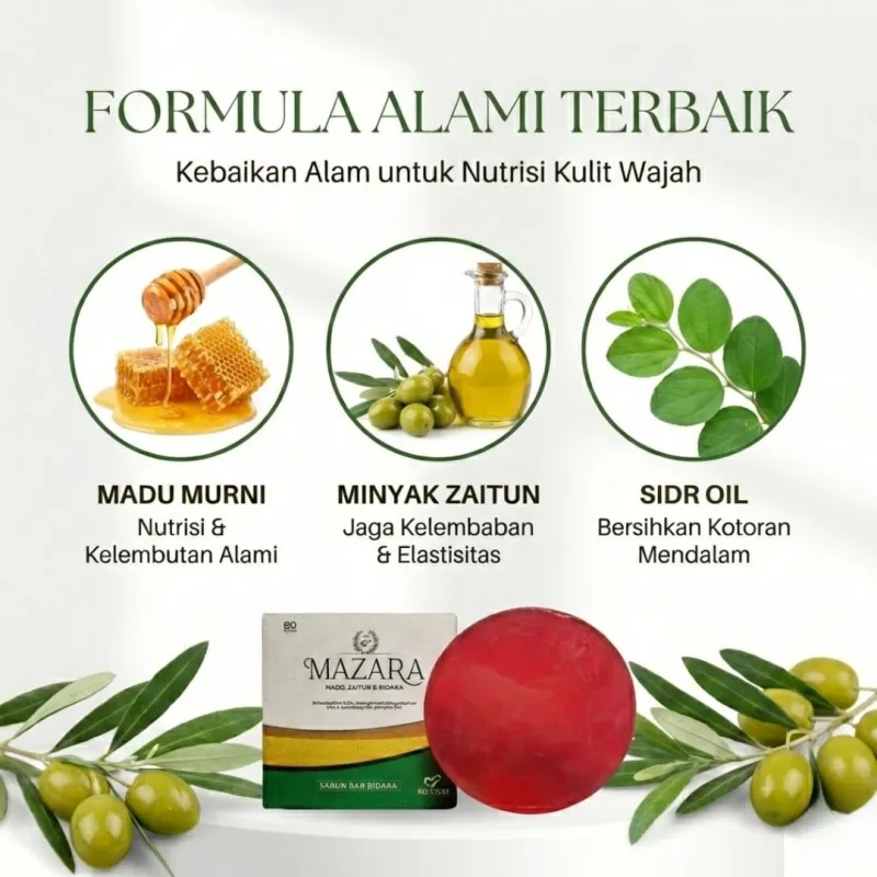Sabun Bar MAZARA (Madu Zaitun Bidara) adalah perpaduan antara Madu, Zaitun dan ekstrak daun bidara serta bahan-bahan lainnya yang mempunyai khasiat serta manfaat yang sangat baik, terutama untuk mengobati berbagai gangguan penyakit pada kulit.